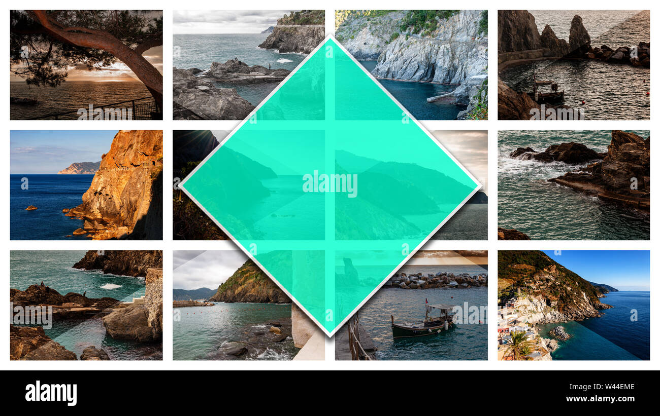 Collage Fotos Von Cinque Terre Italien Im 16 9 Format Das Meer Das Im Schonen Badeort Und Fischer Ein Beliebtes Reiseziel Fur Strand Stockfotografie Alamy